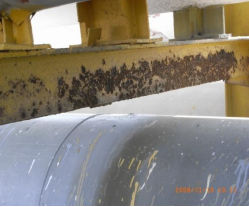 我公司對(duì)長(zhǎng)江石化的設(shè)備設(shè)備進(jìn)行了防腐施工。該項(xiàng)目在現(xiàn)場(chǎng)根本不能機(jī)械噴砂及大面積的人工機(jī)械金屬表面處理,只能簡(jiǎn)單進(jìn)行人工低表面處理,即現(xiàn)場(chǎng)把金屬表面浮及附著力不好的舊漆膜去掉,允許有金屬表面附著較好的舊漆膜,然后進(jìn)行防腐蝕涂層施工?,F(xiàn)場(chǎng)要解決好水汽在施工過(guò)程中對(duì)防腐施工的影響見(jiàn)圖20。圖21為現(xiàn)場(chǎng)難以進(jìn)行噴砂徹底除銹的位置。