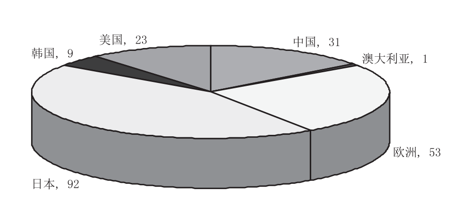 1996 年 1 月 1 日至 2016 年 12 月 1 日,涉及低表面能有機(jī)硅船舶防污涂料技術(shù)的國內(nèi)外專利共有 209 件,圖 1 是各國申請人申請量分布圖,從圖中可以看出, 日本的申請數(shù)量為 92 件,居于首位,其次是歐洲 53 件, 中國 31 件,美國 23 件。