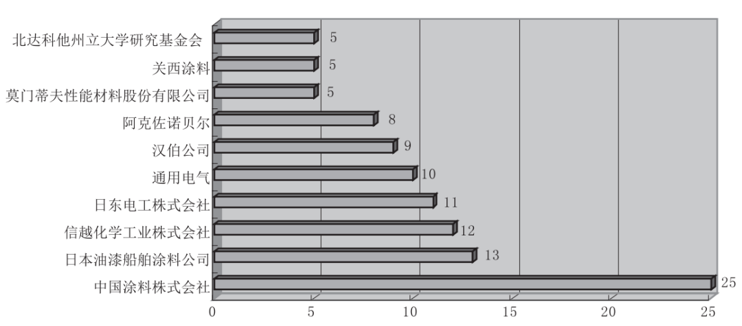 雖然從申請數(shù)量來看,中國申請量也位于前三, 然而,我國在低表面能有機(jī)硅防污涂料領(lǐng)域的研究起步較晚,與國際水平存在著較大差距,從圖 2 國內(nèi)外申請逐年分布圖中可以看出,國內(nèi)申請大多集中于 2007 年之后,而國外申請?jiān)?1996 年左右已有較大申請量,此外,國內(nèi)申請大多集中于樹脂改性方向,保護(hù)范圍普遍較窄,作為一個(gè)有著遼闊海域的國家,在船舶防污涂料的需求日漸增長,而低表面能有機(jī)硅船舶防污涂料核心技術(shù)又大多為國外壟 斷的形勢下,急需加快防污涂料研發(fā)速度,提高國內(nèi)企業(yè)行業(yè)競爭力。