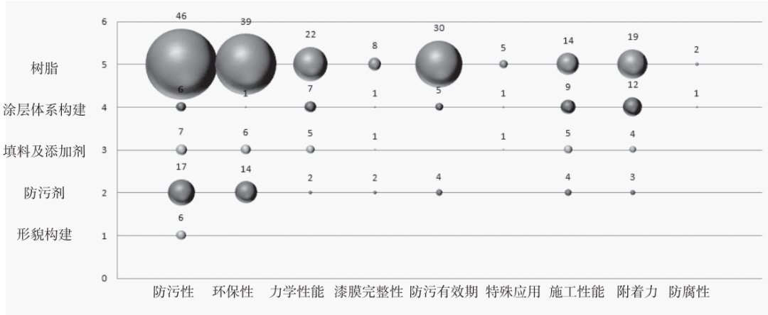 對 209 件專利申請進(jìn)行分析和梳理后,對其中主 要的技術(shù)功效進(jìn)行分析,圖 5 是低表面能有機(jī)硅船舶防污涂料技術(shù)功效分布圖。